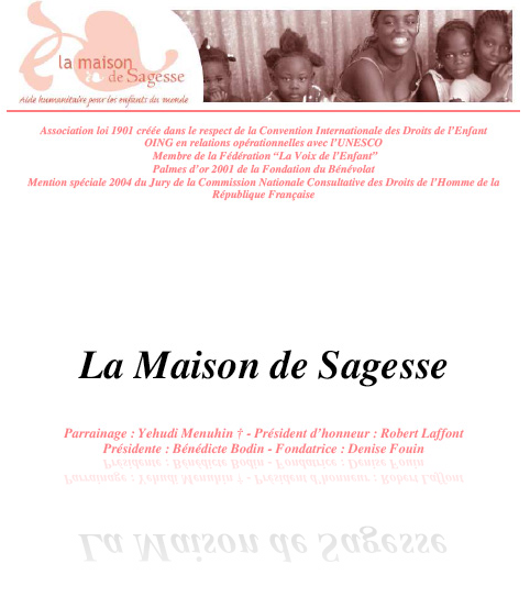 La Maison de Sagesse, OING humanitaire accréditée par l'UNESCO,oeuvre depuis bientôt 15 ans à travers le monde pour apporter son soutien à l'enfance défavorisée. Avec ses partenaires, tels que La Voix de l'Enfant et la Fondation de France, elle a pu ainsi mener à bien de nombreux projets touchant à la scolarisation, l'aide d'urgence, la santé et l'hygiène, mais surtout le développement durable.